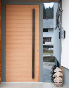 Lesena fasada postaja vse bolj priljubljena, zato smo ustvarili vrata, ki se z njo popolnoma ujemajo. Masivne letve se nadaljujejo s fasade na vrata. Možnost vertikalne, prečne ali diagonalne postavitve. Lahko nam dostavite svoje deske, ki jih nato ustrezno obdelamo. Unikaten videz dajeta naravno raznolik macesnov ali dolgo obstojen hrastov les. Za ljubitelje temnejših odtenkov je prava izbira termo jesen, ki je toplotno obdelan les za večjo odpornost na zunanje atmosferske vplive.