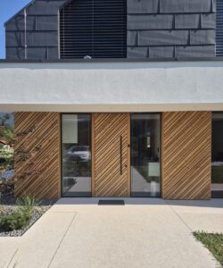 Črni dodatki za vhodna vrata poudarijo naravno toplino lesa in ustvarijo sodoben, kontrastni videz. Kombinacija lesa in črne barve daje vratom eleganten in izrazit značaj.